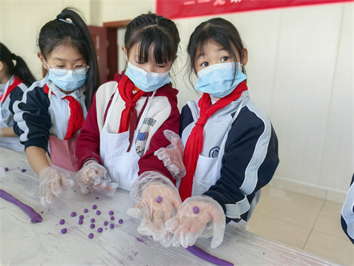 “快看我的粉色面团!”“我要捏个小星星!”近日,无锡市石塘湾中心小学的丰喜美食坊变成了欢乐的厨房。三(7)班的同学们系着小围裙,在家长志愿者帮助下,正热火朝天地制作传统美食——彩色小圆子。